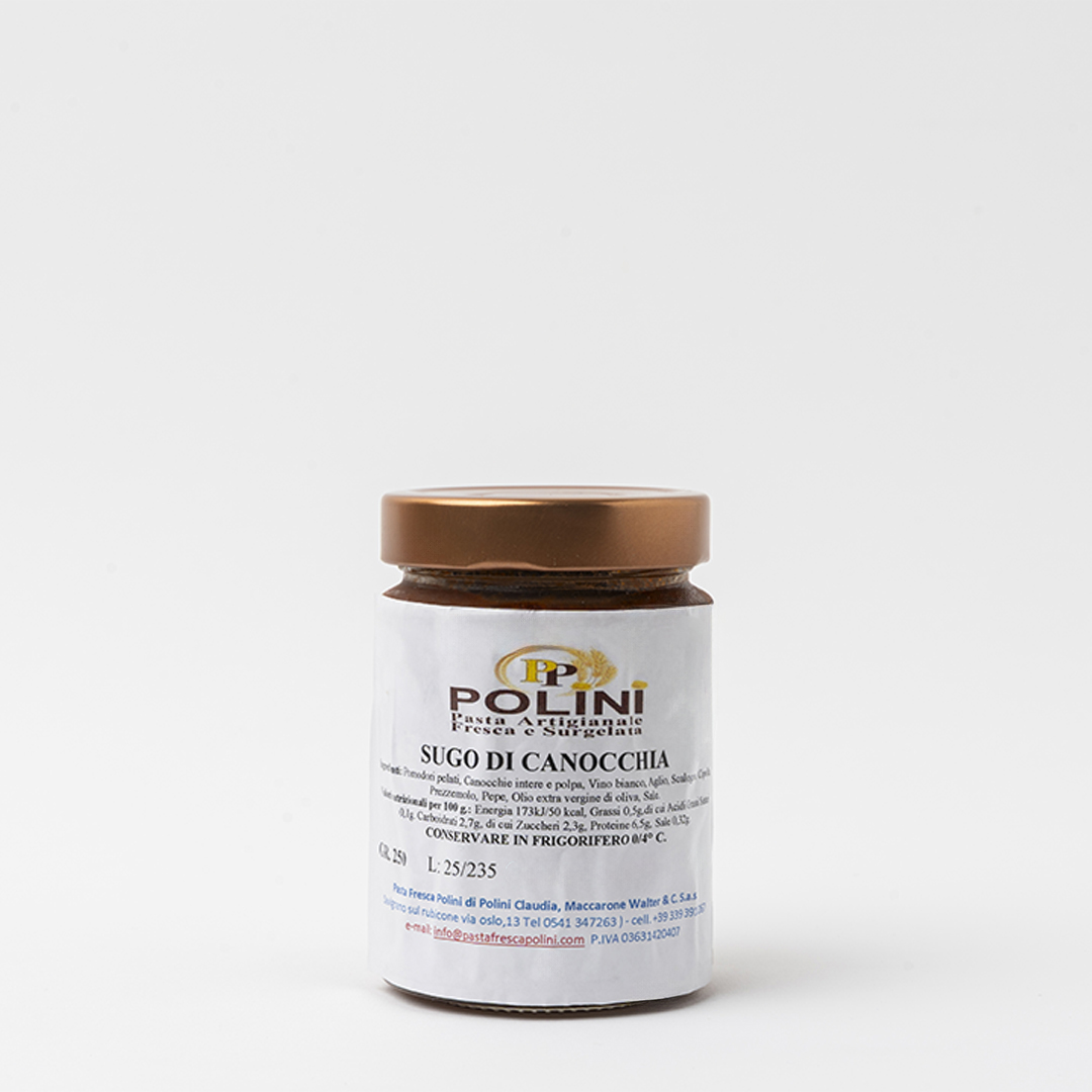 Pomodori pelati, canocchie intere e polpa, vino bianco, aglio, scalogno, cipolla, prezzemolo, pepe, olio extravergine di oliva, sale.